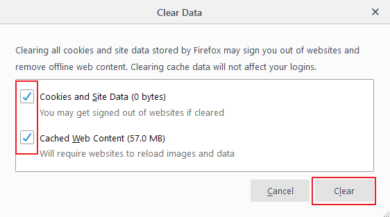 - Check both Cookies and Site Data and Cached Web Content, and then click Clear.